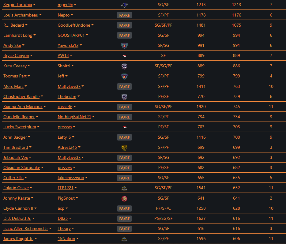 It’s been awhile since we’ve seen a tournament featuring player agencies all time lineups. Since the PSanchez55 agency has produced 5 SBA players, this idea has begun to intrigue me. I’m contemplating running such a tournament, but also, file work in the sim sounds awful. While it remains to be seen if I attempt such an endeavor, I will type up this article going over many of the users who have enough creates to field a team. Disclaimer: I have no idea how legacy position eligibility worked. Team PigSnout PG: Lemony Snicket SG: Janet Snakehole SF: Johnny Karate PF: Kane Fox 😄 Othello Hawkins 6th Man: Burt Macklin 7th Man: Count Olaf 8th Man: Kane Fox Jr. 9th Man: Morgrim Shadowshield Look, if you’ve been around the SBA very long at all, you’ve come to expect a few things from PigSnout. Loyalty; consistency; and superstar, MVP caliber, HOF bigs a team can build around. So, in a tournament where I’ve decided positional eligibility applies, how does Team PigSnout stack up? Well, Burt Macklin once again finds himself coming off the bench, and Johnny Karate arrived just in time to give this team a small forward. The talent is undeniable, but can all this scoring talent thrive on one roster? Team TownBizness: PG: Hera Hernandez SG: Rasheeda Rider SF: Rasheed Rider PF: YoungBoy SBA 😄 King Kunta 6th: Adebowale Adekoya 7th: Certified Boogeyman Say what you want, but the TownBizness agency produces consistent Hall of Fame talent. The starting lineup alone features 7 MVPs and more positional awards than I feel like counting. King Kunta, considered by many to be the greatest player in league history, leads a team brimming with offensive talent. Critics will likely bring up that many of these players were the beneficiaries of the dreaded funnel strategy and that on this roster, no such team build exists. There is in fact only one ball, but it’s hard to bet against a team with likely 7 Hall of Famers. Team PSanchez55 PG: Javier Ramirez Jr SG: Isaiah Green SF: Jehu King PF: Dovydas Zukauskas 😄 Tavas Zukauskas 6th: Nile Rivers 7th: Medium Rob One First Team All-SBA at the SBA level and only a few seasons being in contention for a positional award – the PSanchez55 agency doesn’t have near the star power of many of the other teams in this tournament. In fact, the bench is made up entirely of fillers, and the starting center didn’t even eclipse 700 tpe. Dovydas is a monster- had he reached 100% of his potential maybe he is a multitime PFoty and perhaps even an MVP. And… Jehu proved he could carry a team in whatever that side season was. But, hypotheticals aside, this team is just not talented enough to compete against the HOF laden teams in this field. Team GoodLeftUndone PG: Sofija Pavlovske SG: Stephen Sheppard SF: Gareth Lennox-Upshaw PF: Marquise Washington 😄 Malik Washington 6th: Dio Brando 7th: Alex Sheppard 8th: RJ Bedard 9th: Marcus Vinson 10th: Ogi Amarou Well, this team runs 10 deep. The Washington’s do a bulk of the heavy lifting in the awards category, but Stephen Sheppard was the first SG to win MVP. The starting lineup features one of the best passing point guards of all time in Sofija, and the ultimate glue guy in, well, GLU. With the team build and insane depth, Team GoodLeftUndone should be among the better teams in the competition. Team Traphag PG: Diego Rossi SG: Elana Rossi SF: Maya Witherspoon PF: Olympia Styles 😄 Robert “Big Rob” Wadlow 6th: Pierre Manslapper 7th: Kitty O’Sullivan Krauss Team Traphag - the agency run by everyone’s favorite former commissioner features some of the best wing(wo)men in SBA history: Elana Rossi and King Kunta in OKC, Witherspoon and Shadowshield in Arizona, and of course the legendary admin superteam in Mexico with Olympia Stiles and Hera Hernandez. It’s a very strong roster despite that Deigo Rossi character. With Big Rob anchoring the paint, and a bunch of old man fillers, anything is possible. Team NothingButNet PG: Jack George SG: Kaleb Grant SF: Quedelle Reaper PF: Johnny Wick 😄 Joey Callaway 6th: Tanya West The playmaking of Joey Callaway surrounded by several exciting scoring threats make Team NBN interesting. This group showed a lot of promise, but none of these guys ever quite broke into SBA stardom. Team DeityofIce PG: Tony Marcedo Jr. SG: Colton Caesar SF: Jevon DeVaughn PF: Darren Oliver 😄 Jonah DeVaughn 6th: Juhani Pakkala 7th: Tony Marcedo 8th: Blocky Maivia Team DOI doesn’t quite have the awards case that some of the other teams will boast. Darren Oliver, of course, retired as the all-time leading scorer and rebounder in St. Louis Battalion history. Despite the lack of hardware, this team does have talent. Jonah DeVaughn was an incredible scorer, but found himself in a tough scoring environment on a very offensive Rail team. TMJ was a great piece for a Monarchs team that couldn’t quite break through in the postseason. History makes for narratives, but all that matters will be how this group plays together when/if this mythological tournament occurs. Team Evans PG: Asher Moxley SG: Ragnar Lesnar SF: Black Lotus PF: DiAngelo DiBiase 😄 Giovanni Owen Allen Tatum 6th: Halo Helmsley Honestly, I am unaware of the legend of Black Lotus or DiAngelo DiBiase. Halo Helmsley means very little to me. But, I am prone to expect great things from Team Evans solely based on the existence of one Giovanni Owen Allen Tatum. Having GOAT for initials is a bold choice, but GOAT lived up to the hype. The 2x MVP and 3x Center of the Year is one of the greatest players of all time: it wouldn’t be a surprise if he led a strong Team Evans on a deep run in this tournament. Team Emidas PG: Cero Miedo SG: Emidas Blair SF: Eikichi Onizuka PF: Lefty Blairtelho 😄 Mr. X 6th: Marc Spector 7th: Emidas Blair Jr. This is the part where my confusion about legacy positions really came into play. Regardless, this roster is incredibly stacked. Miedo won multiple DPOYs as a freak PG, Onizuka won 5 positional awards acr